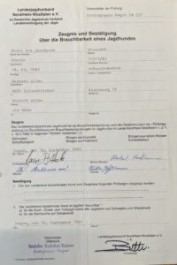 Unsere Hündin Akira vom Stadtpark bestand die Prüfung über die Brauchbarkeit eines Jagdhundes und zeigte wie vielseitig ein Hovawart einsetzbar ist.